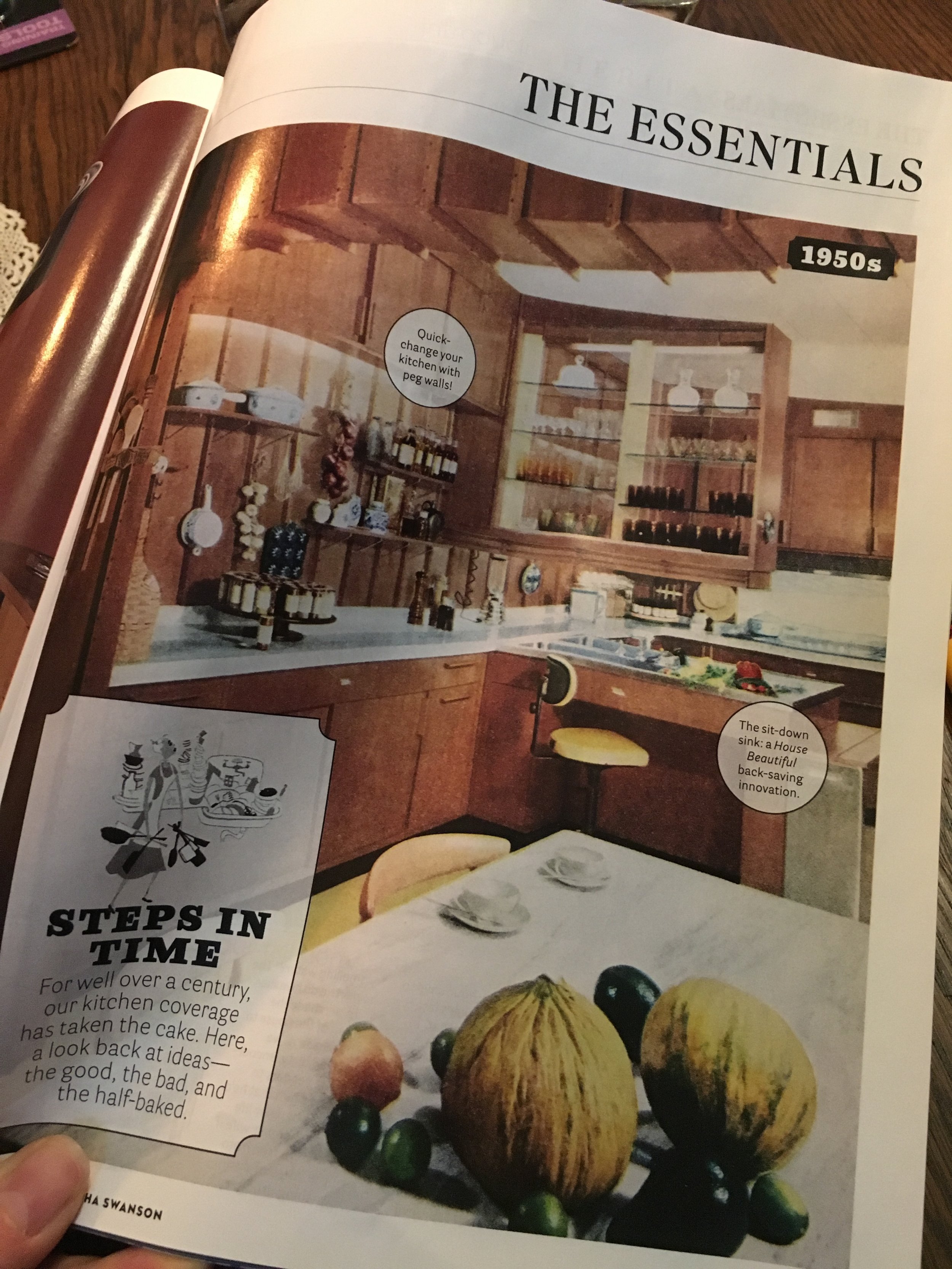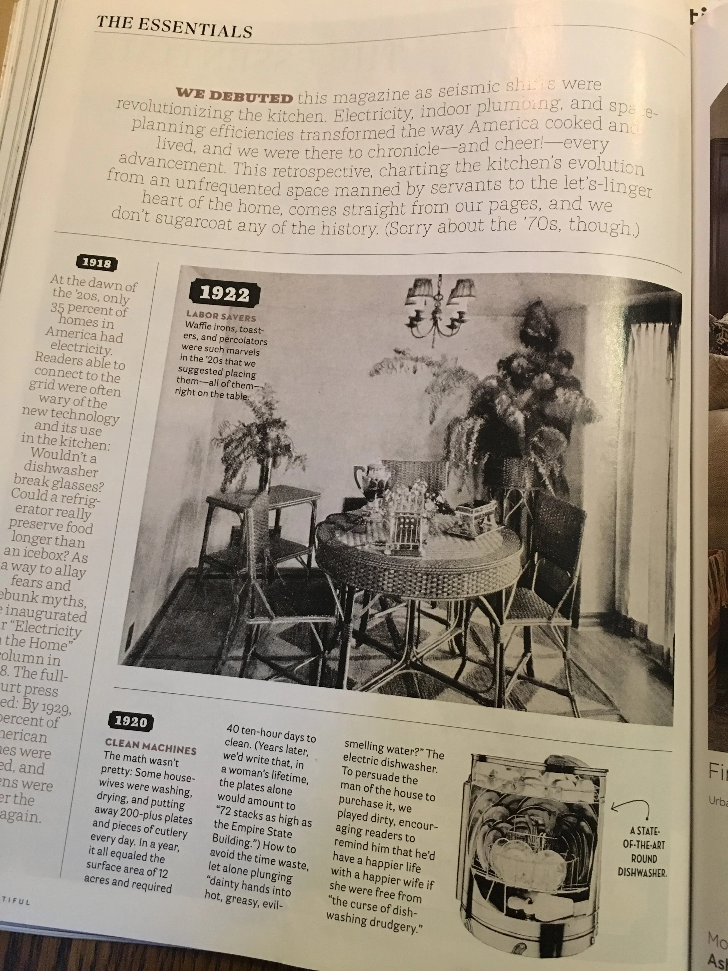 well as I sit here looking at the magazines celebration of their 120 year history im deeply interested and effected by the images and design ideas of the past. Like the one that says to place all your small appliances on the table. This advice strikes me for 2 reasons: one being how boastful and showy this display seems, and secondly that the appliances and the thinking are so outdated!